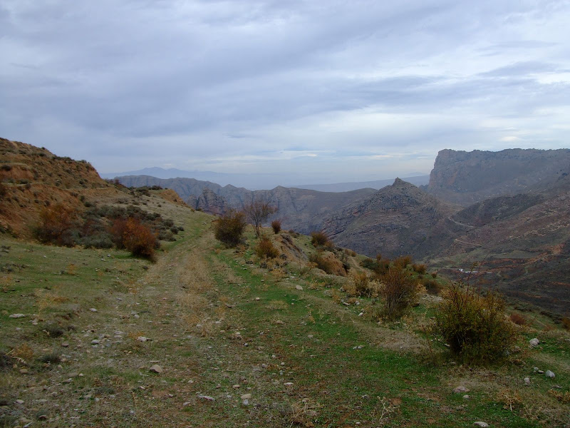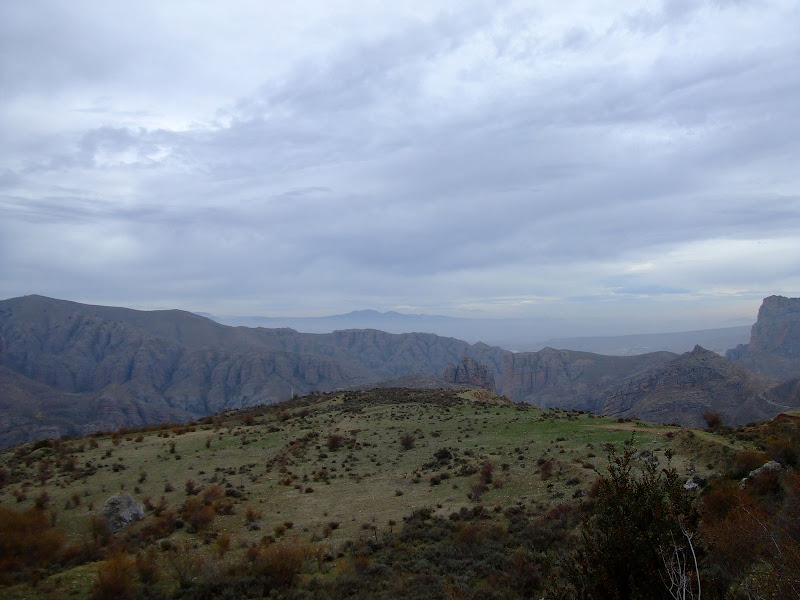 Esta ascensión la realizamos Clemente y yo en Febrero de 2.007. Ese sábado trabajamos los dos por la mañana, por lo que tuvimos que salir de Villena con dirección a Granada alrededor de las tres de la tarde. Hicimos nuestra parada obligatoria en Petrer para comprar provisiones y echar un bocado rapido a base de laterío y embutido. El viaje se hizo ameno, conversando sobre los avatares de la semana y escuchando las novedades musicales que traía Clemente. En pocas horas estabamos en La Calahorra, nos dejó sorprendidos su magnífico castillo, pero todavía nos quedaba subir el puerto de La Ragua, donde se encuentra el refugio en el que se suponía ibamos a pasar la noche. Después de muchas curvas y ya en plena noche cerrada llegamos a lo alto del puerto, y divisamos el refugio, justo al lado de la carretera. Este refugio se encuentra a 2.000 metros de altura, por lo que el desnivel que nos esperaba al día siguiente era tan solo de 600 metros. Cogimos las mochilas y entramos al refugio a pedir alojamiento. Cual fué nuestra sorpresa cuando la gente que había dentro, varias parejas con niños, nos comentaron que el refugio lo habían alquilado ellos para pasar el fin de semana y que no quedaba sitio. El refugio por lo visto pertenece a la Junta de Andalucía, y lo alquilan como si fuese una casa rural.¡ Mierda! ¿y ahora que hacemos? Pues toca plantar la tienda. Menos mal que Corbí dejó su tienda en mi coche hace dos semanas cuando subimos al Veleta, porque osino nos toca dormir al raso. Con los frontales puestos y una temperatura bajísima nos pusimos a montar la tienda. Nos dolían las manos, pero no había más remedio. Buscamos un llano entre la pinada de al lado del refugio. Vimos una furgoneta allí aparcada, y se oían perros ladrar. Pero no nos imaginábamos que el escándalo perruno iba a ser mucho mayor. Una vez montada la tienda cenamos algo y automáticamente, vestidos con toda la ropa de abrigo, nos metimos en los sacos a dormir. A la media hora el escándalo en la calle era tremendo. Veinte perros ladrando como locos. Nos asomamos, y nos quedamos flipando. Resulta que la furgoneta allí aparcada era de una pareja que había ido a entrenar con sus perros y su trineo, y el chico había decidido dar una vuelta nocturna. Joder, menudo susto cuando me ví todos esos perros corriendo como locos y una lucecita detrás, que resultó ser el piloto. En un principio, la oscuridad nos hizo pensar cosas tenebrosas, ¿y si es una manada de lobos hambrientos? Pero no, solo eran perros tirando de un trineo. Cuando llegaron un rato más tarde los perros ya no ladraban y pudimos descansar tranquilamente. Hasta las cinco de la mañana. Cuando Clemente y yo nos despertamos congelados. El frio nos hizo despertar y ya no dormimos. Solo quedaba esperar a que amaneciese. Jamás me había dado tanta alegría ver el sol. En cuanto amaneció, desayunamos, un café estilo Castelo, es decir, cogimos un calcetín (limpio) y metimos el café que Castelo había traido de Honduras, y lo colamos en agua caliente. Estaba asqueroso. Acto seguido nos pusimos el traje de faena y nos dispusimos a subir al Chullo. El Chullo es el pico mas álto de la provincia de Almería y se encuentra en las estribaciones del macizo de Sierra Nevada, resulta una ascensión sencilla pero muy bonita, ideal para hacerla con raquetas. Pero nosotros como no tenemos raquetas, la hicimos con crampones. Al salir nos encontramos con el piloto del trineo de perros y nos pusimos a hablar con él. Nos dijo que estaba entrenando, porque participaba todos los años en el Pirena. Era de Almería y estaba allí con su novia. Nos pareció un chaval muy majo. Nos enseñó el trineo y nos dió unas cuantas indicaciones para subir sin perdernos. Cogimos la senda que asciende al Chullo y nos tocó de abrir huella, aunque sin problema porque la nieve estaba totalmente helada. En cuestión de dos horas estabamos arriba. En la cima el viento era insoportable y hacía que la sensación térmica fuese muy baja. Además, arrastraba pequeños trozos de hielo, uno de los cuales me dió, con muy mala suerte, en todo el ojo, en un momento en el que me quité las gafas de sol para limpiarlas. Fuí todo el dia con el ojo molesto. Decidimos bajar a un pequeño refugio vivac que hay en un roquero cercano a la cima para echar un bocado. Desde allí se veía una excepcional panorámica de Sierra Nevada. Una vez almorzados nos pusimos a caminar hacia el punto de partida, encontrandonos con varios grupos que subían entonces a hacer la misma cima. En hora y media estabamos otra vez en el coche. El refugio de La Ragua tiene un pequeño bar en un lateral y esa manaña estaba abierto. Había un montón de gente. Entramos y pedimos las cervezas del triunfo y un par de tapas. Nos encanta que los planes salgan bien. Eran sobre las dos de la tarde por lo que decidimos hacer un poco de turismo. Bajamos el puerto y visitamos un pequeño pueblo al que entramos por lo chocante de su nombre: Dólar. A continuación pusimos rumbo a La Calahorra donde visitamos el castillo que tanto nos había llamado la atención el día anterior, y acto seguido pusimos rumbo a Villena, no sin antes parar en Guadix para meternos un plato combinado entre pecho y espalda.